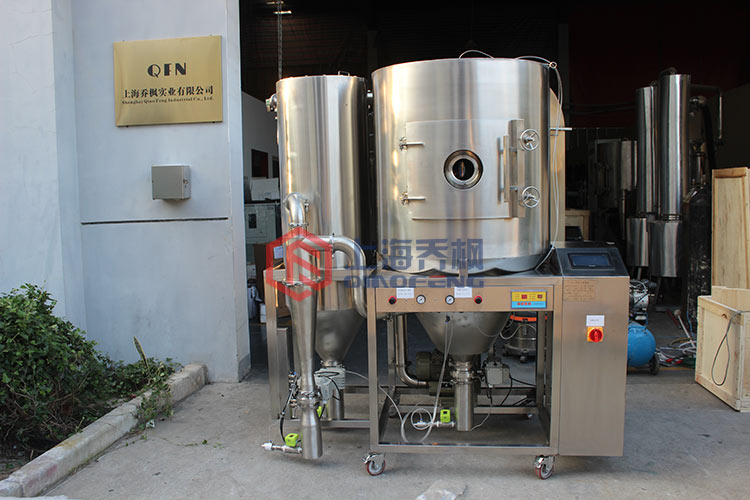 噴霧干燥機是流化技術用于液態(tài)物料干燥的一種較好的方法。基本原理是空氣通過過濾器和加熱器,進入干燥塔頂部的空氣分配器,通過熱風分布器的熱空氣呈螺旋狀均勻地進入干燥室。料液由料液貯罐經(jīng)過濾器由泵或者壓縮空氣送至干燥塔頂?shù)撵F化器,使料液噴成極小的霧狀液滴,料液與熱空氣并流接觸,接觸表面積大大增加,水份迅速蒸發(fā),在極短的時間內(nèi)干燥為成品。成品由干燥塔底部和旋風分離器排出,收集瓶回收,廢氣經(jīng)濾袋過濾器收集細粉后由風機排出。