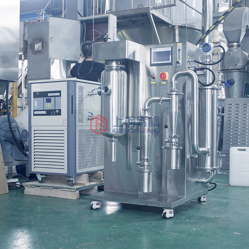 首先,液態物質被送入噴霧器中,在高速噴嘴的作用下,噴出微小的顆粒狀物料形成霧滴,然后這些霧滴在干燥室中與高溫高壓的熱風相互作用。在瞬間高溫高壓作用下,霧滴逐漸失去水分,由此升高了氣體的濕度,并在空氣的擾動和攪拌下,將干燥室內氣體的溫度和濕度保持在一定的范圍內。
