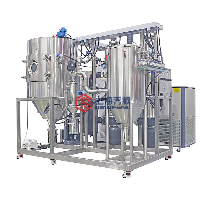 設備主要由:送料系統、加熱系統、霧化系統、噴霧干燥系統、惰性氣體循環系統、產品回收系統、冷凝系統組成。