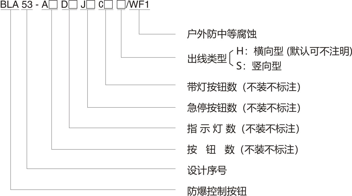 > 例如:需要 防爆控制按鈕 帶1個紅色按鈕、1個綠按鈕和1個黃色按鈕,則產(chǎn)品型號規(guī)格為:BLA53-A3S。